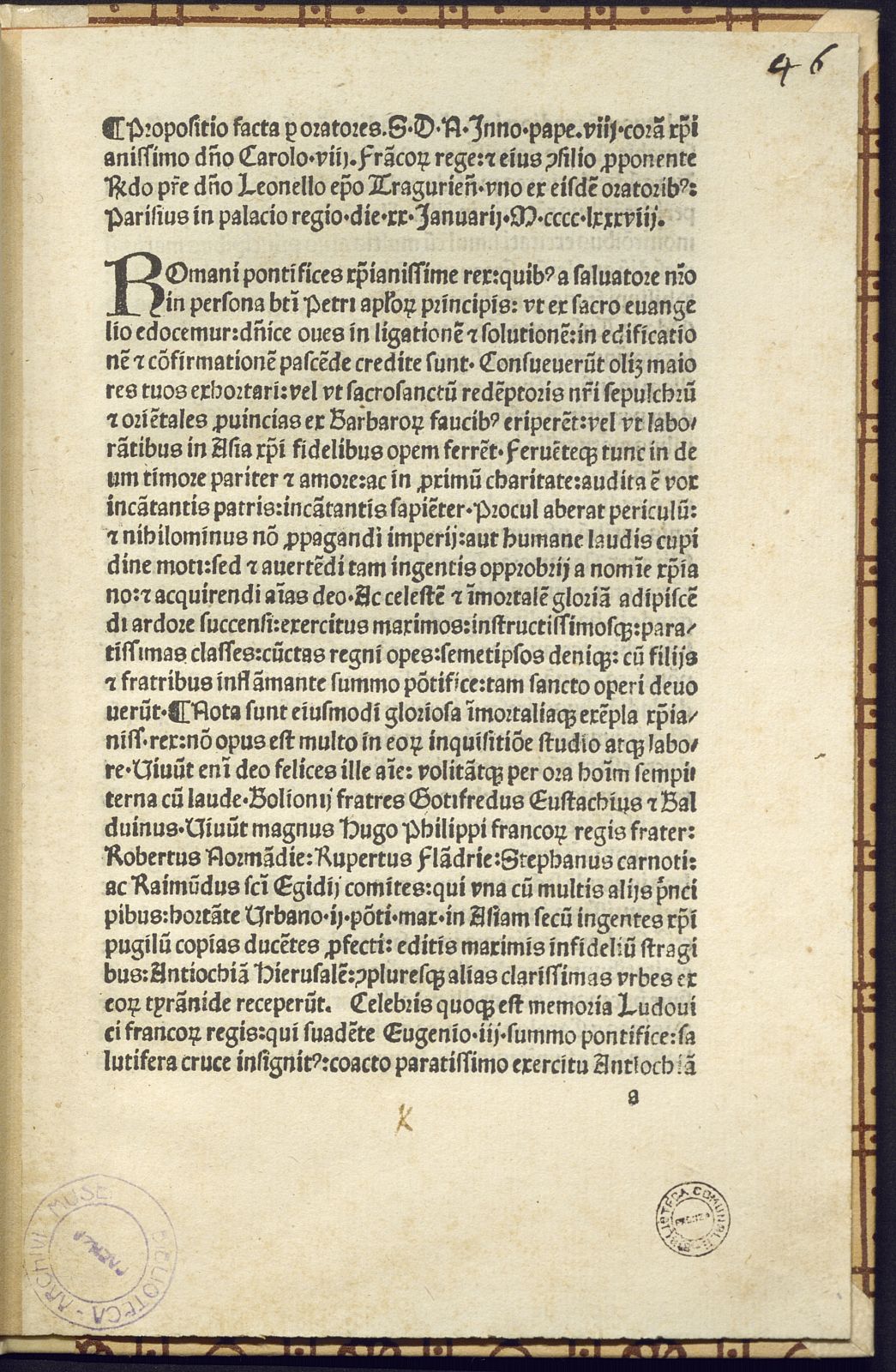 Propositio facta per oratores S.D.A. Inno pape VIII coram Christianissimo domino Carolo VIII Francorum rege: & eius consilio proponente: reuerendo patre domino Leonello episcopo Tragurien. vno ex eisdem oratoribus: Parisius in palacio regio die xx Januarij MCCCCLXXXVIII. Da repertori Stampato a Roma da Stephan Plannck dopo il 20 gennaio 1488