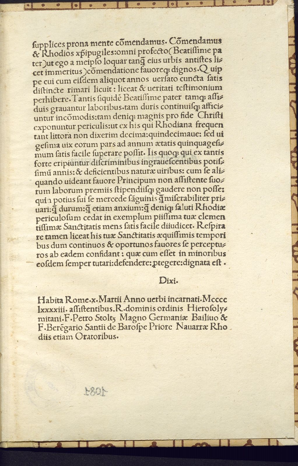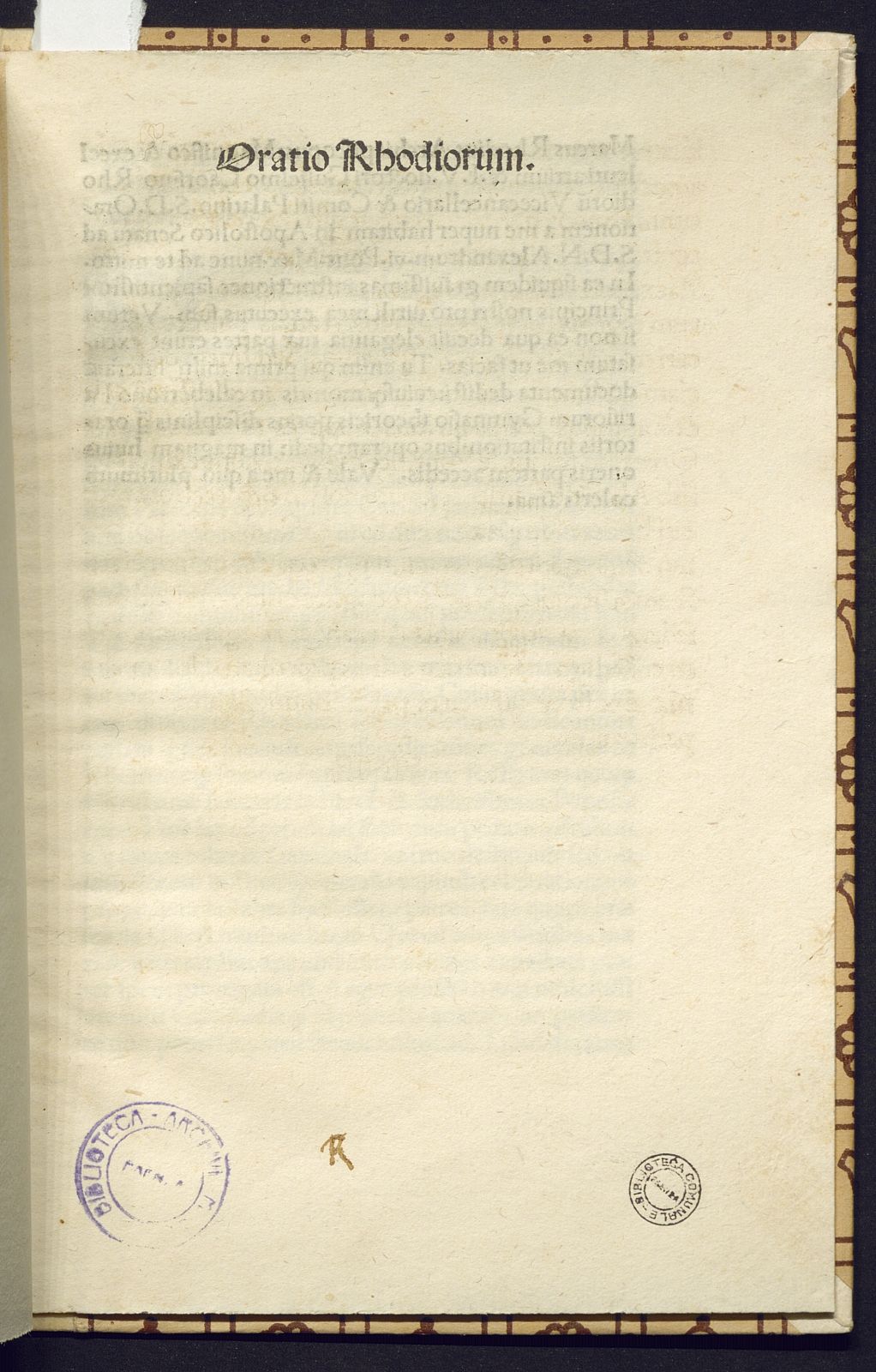 Oratio Rhodiorum [1493]. Attribuzione della stampa Euchario Silber,[4] carte, 4°